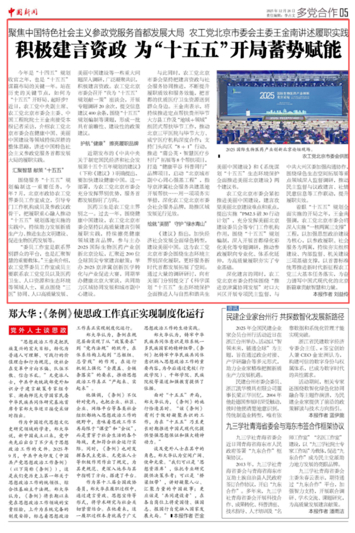 围绕服务“十五五”规划编制这一重要任务,今年7月,北京市政协农工党界委员工作室成立,引导专门工作机构成员及参政议政骨干,把履职重心融入推动“十五五”规划落地实施的实践中,持续助力发展新质生产力、推进生态文明建设、促进生物医药发展等。
