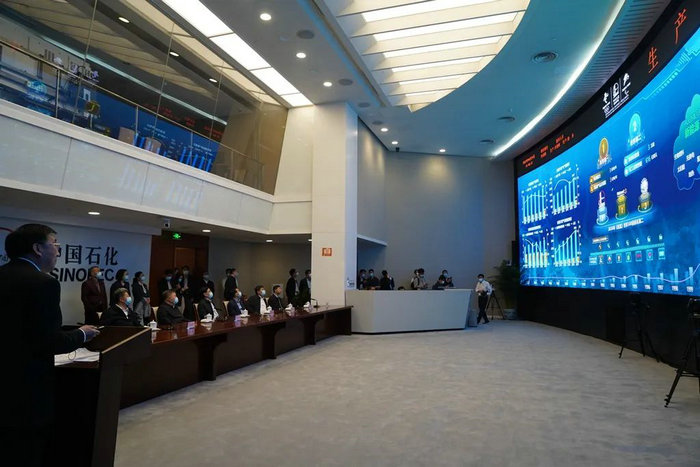 4月24日下午,陈竺、何维率调研组一行在中国石油化工集团有限公司调研,图为参观生产调度指挥中心