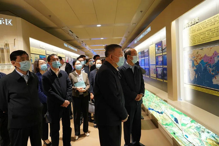 4月25日下午,陈竺率调研组一行在新疆金风科技股份有限公司进行调研,图为参观金风科技展示中心