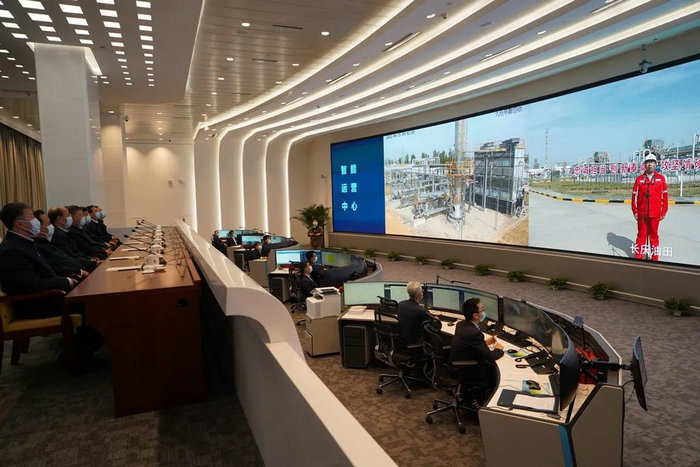 4月25日上午,陈竺、何维率调研组一行在中国石油天然气集团有限公司调研,图为在中石油智能运营中心听取长庆油田一线项目负责人视频汇报