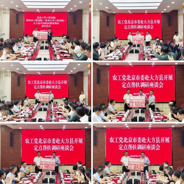 帮扶调研组在大方县召开座谈会。江欣表示,此次帮扶调研卓有成效,大方县日新月异的发展也让大家看到了未来帮扶工作的希望、坚定了倾情倾力帮扶的信心。一是帮扶工作取得新成果,捐赠物资既有医疗设备也有教育用品;二是帮扶模式寻求新突破,促成了以北大口腔医院为主导,贵阳口腔医院、大方县中医医院共同参与的三方协议;三是帮扶目标迎来新方向,围绕农工党中央提出的“推动提高人均预期寿命”以及教育帮扶,市委会将与大方县加强沟通交流,力争做到“对”有效,“接”有果。