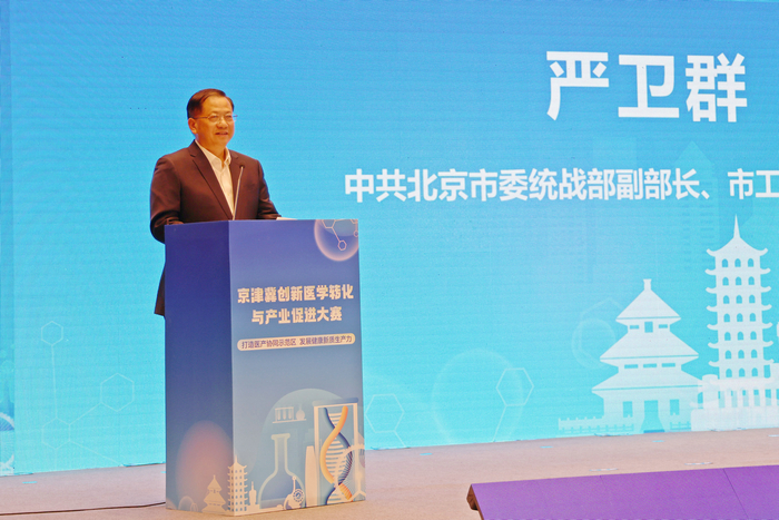 严卫群在致辞中表示,大赛是立足生物医药产业发展优势和城市副中心政策优势,广泛汇聚统一战线资源力量,共同打造京津冀医产协同发展新格局的创新举措。赛马场上寻千里马,试验田里育实干家,要努力把本届大赛办成京津冀地区生物医药产业高标准、高质量、高效益的赛事,切实促进项目落地、产业发展和区域协同。一是以赛促融,助推京津冀协同发展向纵深迈进。大赛将以北京城市副中心为主要平台,汇集三地创新医药资源项目,优势互补、聚链成势,共筑京津冀生物医药产业协同发展新引擎。二是以赛引智,加快培育医药健康产业新质生产力。充分发挥行业企业、科研院所、医疗机构资源优势,招引京津冀乃至全国、全球优质医药健康项目参赛,做好与HICOOL全球创业大赛生物医药赛道的协同,助力提升京津冀区域的创新能力和辐射带动作用。三是以赛赋能,优化京津冀区域服务新生态。用市场化方式为赛事赋能,链接各类投融资机构,精准匹配资金、产业、人才、应用场景等资源,推动更多科技成果从“实验室”到“生产线”再到“大市场”。