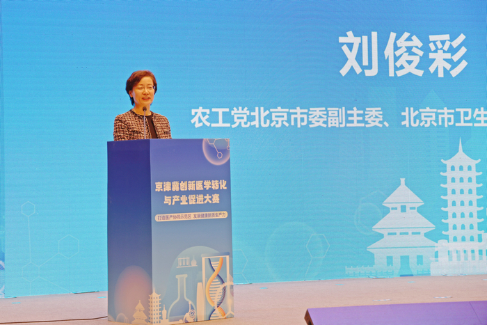 刘俊彩在致辞中表示,中共十八大以来,北京市委市政府深入贯彻习近平总书记对北京重要讲话精神和关于健康中国建设的重要论述,大力实施健康优先发展战略并取得了显著成效,居民主要健康指标达到国际先进水平,北京医药健康产业规模突破万亿,成为北京第三个万亿级产业集群。作为以医药卫生为主要界别特色的参政党,农工党北京市委将对标健康中国建设要求和京津冀协同发展战略实施,充分发挥特色优势,以大赛为平台,促进“京津冀医产协同”资源合作,为区域医学科技成果转化提供平台和支撑。针对入围项目不同阶段特点和需求,组织定向赋能,提供知识产权服务、医工交叉对接、投融资及应用场景赋能,为优质参赛项目开展精准对接会、政策会客厅等特色活动。积极搭建交流思想、凝聚共识平台,组织知名专家学者、临床、企业、科研院所代表等,共同探讨新发展阶段京津冀生物医药前沿问题,科学建言务实献策,助力医产协同,推动城市副中心高质量发展。