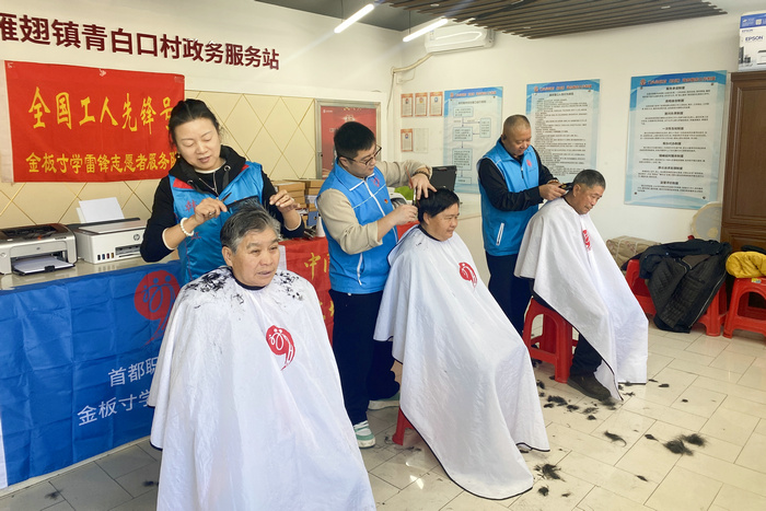 义务理发的师傅工位前早早的排起了长队,师傅耐心的为每一位村民精心修剪,热心的服务和手艺得到村民的交口称赞。