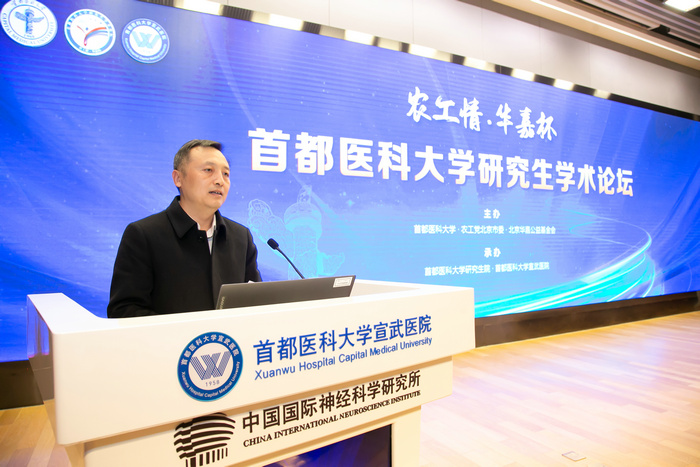 张健代表学校党委,感谢农工党北京市委和华嘉公益基金会对学校研究生教育的大力支持,感谢宣武医院为承办论坛所作的辛勤筹备,同时对所有获奖同学表示衷心祝贺。他指出,研究生学术论坛作为学校一项重要的学术品牌活动,旨在贯彻落实党中央教育强国、科技强国和人才强国战略,落实立德树人根本任务,推进研究生之间的学术交流,营造浓厚的学术氛围。张健鼓励医学生们不仅要有扎实的医学知识和本领,同时要培养勇攀高峰、敢为人先的科学家精神,通过科学研究和临床实践,将攻坚克难的研究成果转化为扶伤济世、治病救人的高强本领,成长为党和国家需要的青年医学人才。
