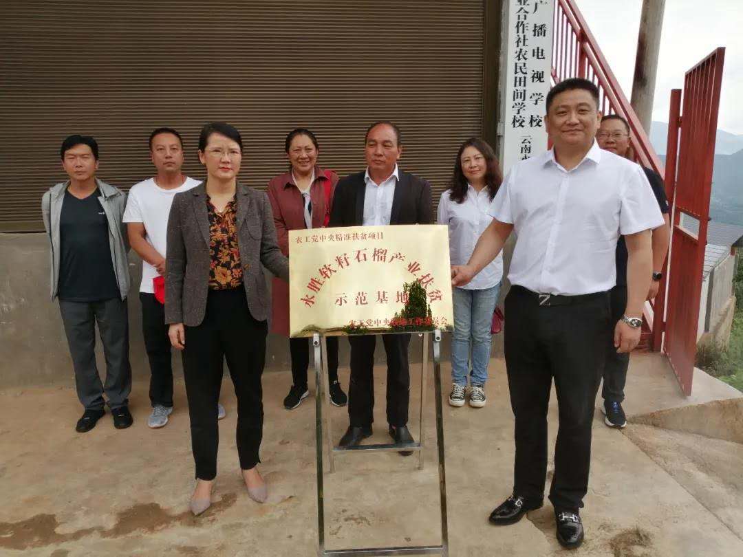 在去年石榴行情的低迷和今年疫情的影响,很多果农对今年的销售前景很是担忧,吴小刚老师得知这个消息也是很焦急。为了解决今年永胜软籽石榴的销售问题,为了永胜软籽石榴产业更健康的发展。吴小刚老师通过农工党中央把公司基地建设成“农工党中央产业扶贫示范基地”,于2020年8月4日正式授牌继续开展脱贫攻坚民主帮扶活动。