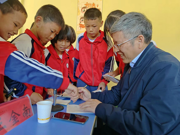 沿着曲折蜿蜒的山路,王金南一行来到大山深处的对江镇元宝同心实验学校调研了解情况。随后,开展了“院士开讲了”活动。王金南作为主讲嘉宾,结合自身成长经历与教师学生们分享人生感悟,勉励学生要“读书为上、刻苦勤奋、诚实守信、人生所值”“行正道万无一失,种新田十有九收”,要坚持梦想、树立目标,未来成为对社会有用的人。王金南对多位学生和教师代表现场提出的问题一一进行了耐心解答,并与学生合影留念,现场气氛活泼热烈。大方县人民政府副县长、农工党大方县工委主委周登印主持活动。