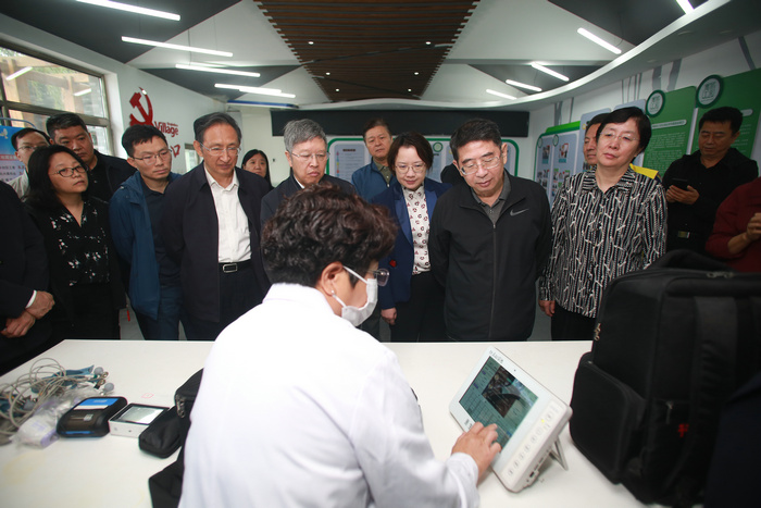 农工党中央专职副主席王路、副主席焦红、副主席王金南、专职副主席兼秘书长邓蓉玲、原专职副主席龚建明到门头沟区青白口村调研,并出席农工党中央与全国政协提案委联合开展的委员履职“服务为民”活动。图为领导观看远程医疗系统演示。