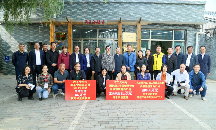 为支持门头沟区灾后重建,农工党中央、农工党北京市委、中国初级卫生保健基金会向青白口村捐款捐物。图为农工党中央和北京市委会领导及部分骨干党员出席捐赠仪式。