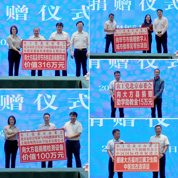 会上,农工党北京市委联合北京市社会发展与环境健康研究会、西藏诺迪康药业股份有限公司向大方县及毕节市各区县捐赠药品,价值316万元;联合北京市社会发展与环境健康研究会、无锡海斯凯尔医学技术有限公司向大方县捐赠检测设备,价值100万元;联合灵镜玉虚智能科技(上海)有限公司向毕节市捐赠数字人城市推荐官帮扶项目;联合社会服务委员会向大方县捐赠助学助教金15万元;联合中国初级卫生保健基金会、中国国际投资促进会援建大方县对江镇卫生院中医馆改造项目。