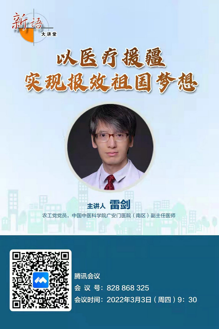 3月3日上午,农工党北京市委举办2022年第一期新语大讲堂,邀请中国中医科学院广安门医院南区麻醉疼痛科副主任医师雷剑做《以医疗援疆实现报效祖国梦想》报告。市委会领导班子部分成员、各基层组织、党员骨干及机关干部230余人参加活动,市委会专职副主委、一级巡视员李亚兰主持活动。