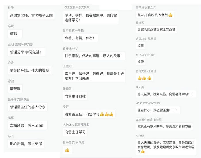 雷剑同大家分享了自己医疗援疆的亲身经历,讲述了他在新疆和田挂职一年间的事迹。在挂职期间,他用自己的医术和专业知识救治当地各族群众,培训当地医务工作者努力为和田打造一支“带不走”的医疗队伍,他还带动身边的人支援当地脱贫攻坚工作,如组织为当地儿童捐赠书籍等公益活动。雷剑还介绍了当地风土人情和发展形势,就如何扶贫扶志巩固脱贫攻坚成果谈了自己的思考和建议。雷剑的事迹感染了大家,听众们反响热烈纷纷点赞。