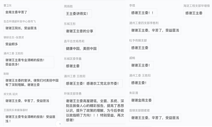 大家纷纷表示,要以此次学习为契机,进一步深入学习贯彻习近平生态文明思想,广泛统一思想、凝聚共识、坚定信心,充分发挥农工党界别优势,切实将学习中共二十大精神的成果转化为履职动能,为建设美丽中国做出贡献。