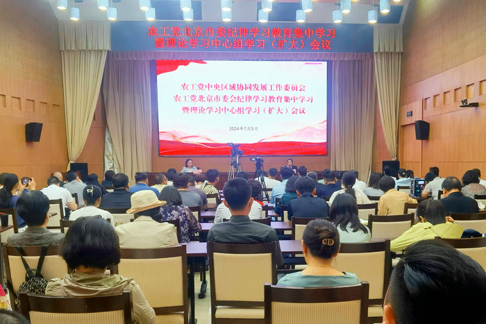 2024年7月5日下午,农工党北京市委联合农工党中央区域协同发展工作委员会,在京举办纪律学习教育集中学习暨理论学习中心组学习(扩大)会议。农工党中央专职副主席兼秘书长、中央内部监督委员会副主任邓蓉玲出席,并作《加强纪律学习 营造农工党风清气正的良好政治生态》专题辅导报告。学习由农工党中央区域协同发展工作委员会主任、北京市委会纪律学习教育领导小组副组长、北京市委会专职副主委江欣主持。