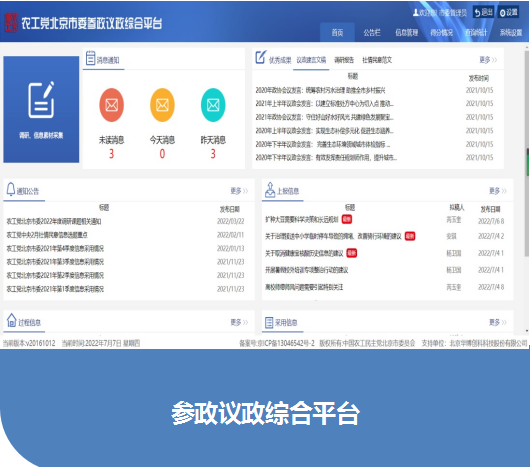 1.参政议政综合平台。集社情民意信息报送、调研和信息素材采集功能为一体,党员可通过平台报送社情民意信息、调研素材线索,实现信息实时编辑、采用、统计及系统管理。平台为党员提供了议政建言文稿、调研报告、社情民意信息等各类优秀参政议政成果,有效激发党员参政议政的积极性,提高社情民意信息收集的便捷性、安全性和时效性。