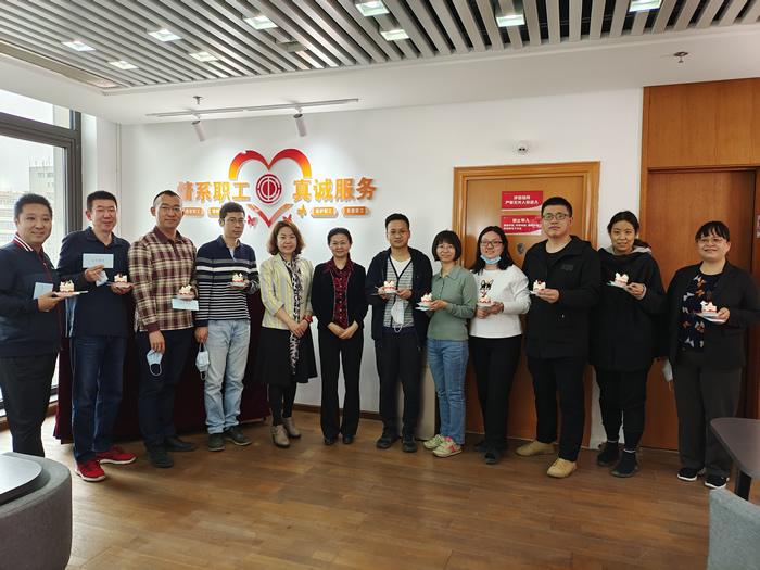会后,领导和同志们一起为过生日的同志们庆祝,并合影留念。