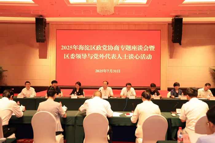 7月31日,2025年海淀区政党协商专题座谈会暨区委领导与党外代表人士谈心活动举办。中共海淀区委书记张革与各民主党派海淀区(工)委会、区工商联负责人和无党派人士代表深入交流。农工党海淀区委主委曹卫东,副主委胡敏健、张盼月、芮玉奎、肖京、姚云峰,副主委兼秘书长马玲参加活动。