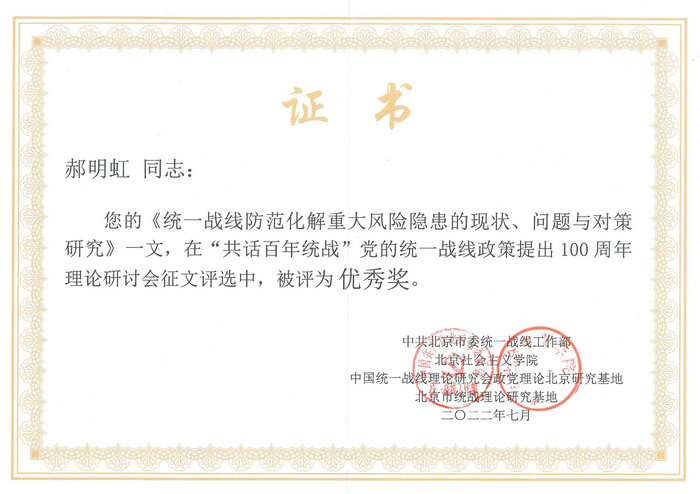 国家市场监管总局食品抽检司二级巡视员、农工党北京市委委员郝明虹报送的《统一战线防范化解重大风险隐患的现状、问题与对策研究》获得优秀奖。