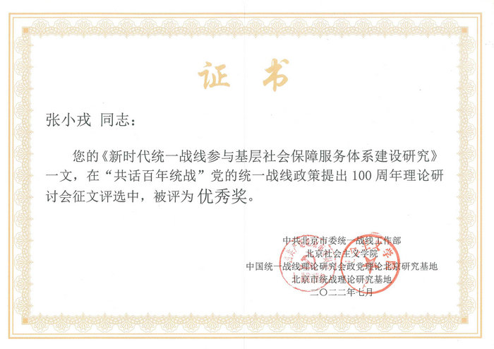 北京经济技术开发区社会保险保障中心主任、农工党党员张小戎报送的《新时代统一战线参与基层社会保障服务体系建设研究》获得优秀奖。