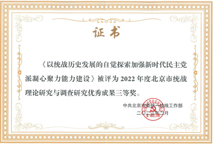 近日,中共北京市委统战部印发了《中共北京市委统一战线工作部关于表彰2022年度北京市统战理论研究与调查研究优秀成果和优秀组织单位的通报》,为总结工作、表扬先进,鼓励广大统战理论政策研究工作者的创新热情和积极性,不断拓展统战理论政策研究的广度和深度,经评审委员会评审,报市委统战部部务会批准,决定对优秀成果和优秀组织单位予以通报。农工党北京市委报送的《以统战历史发展的自觉探索加强新时代民主党派凝心聚力能力建设》获得2022年度北京市统战理论研究与调查研究优秀成果三等奖,农工党北京市委被评为优秀组织单位。