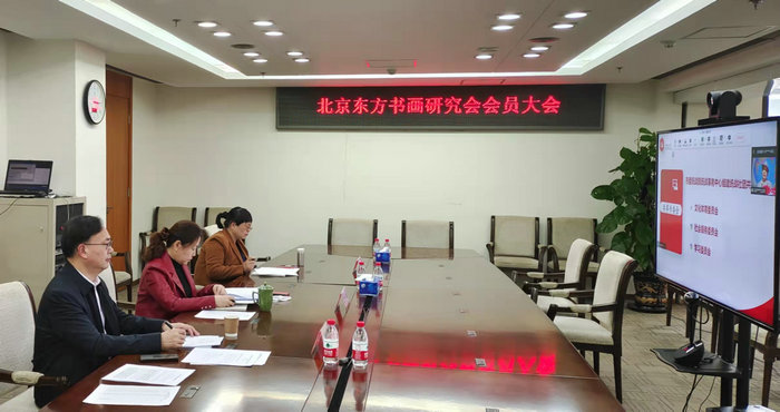 2022年3月25日下午,农工党北京市委北京东方书画研究会会员大会以线上线下相结合方式召开。农工党北京市委秘书长江欣、社会服务处处长张亚娟,北京东方书画研究会会长陈可之,副会长张军、赵增福,监事长刘平等出席会议。各位理事、监事、会员参加会议,市委会社会服务处相关同志列席会议。会议由北京东方书画研究会秘书长刘军主持。